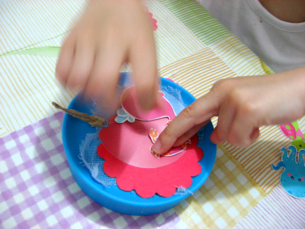 Io ho incollato un'altra garza colorata , Maria ha scelto il fiore scalloped, gli animali attaccati con l'adesivo spessorato, le paillettes, i wood veneer e le conchiglie vere e il colore dell'alfabeto chipboard che abbiamo incollato sia sul barattolo e sia sul tappo.